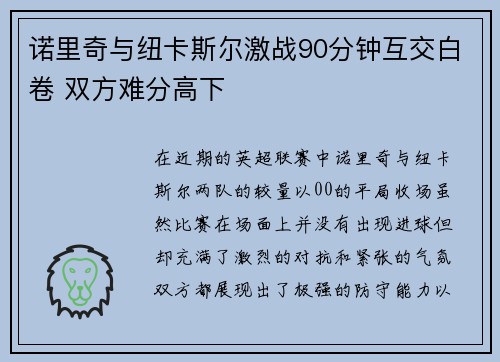 诺里奇与纽卡斯尔激战90分钟互交白卷 双方难分高下