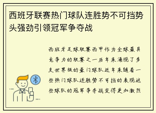 西班牙联赛热门球队连胜势不可挡势头强劲引领冠军争夺战