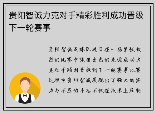 贵阳智诚力克对手精彩胜利成功晋级下一轮赛事