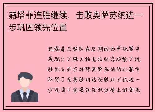 赫塔菲连胜继续,击败奥萨苏纳进一步巩固领先位置
