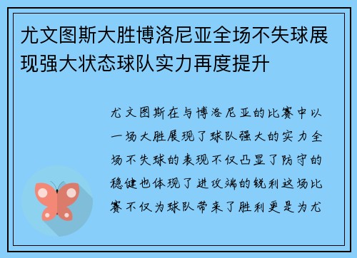 尤文图斯在与博洛尼亚的比赛中以一场大胜展现了球队强大的实力,全场不失球的表现不仅凸显了防守的稳健,也体现了进攻端的锐利。这场比赛不仅为球队带来了胜利,更是为尤文图斯注入了信心,标志着球队状态的再次提升。本文将从四个方面详细分析尤文图斯如何通...
