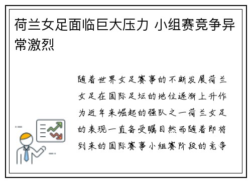 随着世界女足赛事的不断发展,荷兰女足在国际足坛的地位逐渐上升。作为近年来崛起的强队之一,荷兰女足的表现一直备受瞩目。然而,随着即将到来的国际赛事,小组赛阶段的竞争异常激烈,荷兰女足面临着巨大的压力。首先,她们需要在竞争激烈的小组赛中脱颖而出...