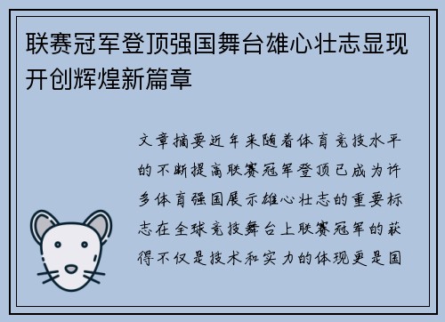 联赛冠军登顶强国舞台雄心壮志显现开创辉煌新篇章