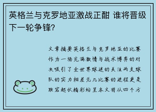 文章摘要:英格兰与克罗地亚的比赛,作为一场充满激情与战术博弈的对决,吸引了全世界球迷的关注。两支球队的实力相差无几,比赛的进程更是跌宕起伏,精彩纷呈。本文将从四个方面详细阐述这场激烈的较量。首先,从历史对战的角度回顾英格兰与克罗地亚过往的比...