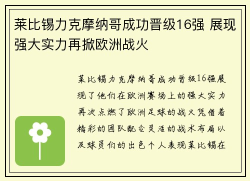 莱比锡力克摩纳哥成功晋级16强 展现强大实力再掀欧洲战火