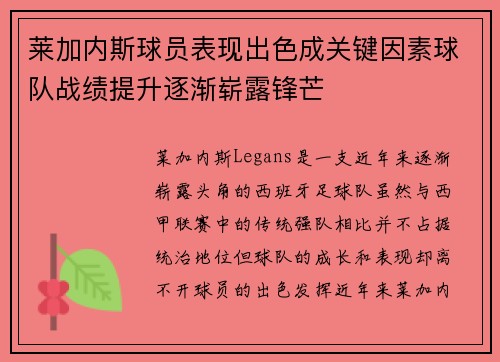 莱加内斯球员表现出色成关键因素球队战绩提升逐渐崭露锋芒