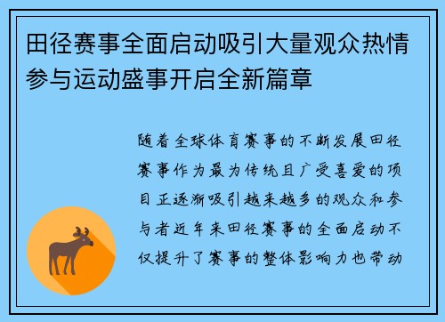 随着全球体育赛事的不断发展,田径赛事作为最为传统且广受喜爱的项目,正逐渐吸引越来越多的观众和参与者。近年来,田径赛事的全面启动不仅提升了赛事的整体影响力,也带动了社会各界对运动的关注与参与。在这一进程中,田径赛事的多元化、专业化发展成为了关...