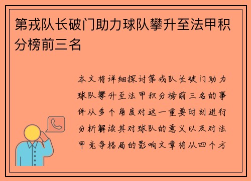 本文将详细探讨第戎队长破门助力球队攀升至法甲积分榜前三名的事件。从多个角度对这一重要时刻进行分析,解读其对球队的意义以及对法甲竞争格局的影响。文章将从四个方面展开分析,首先从第戎队长个人表现的角度讨论破门的重要性;接着分析这粒进球对球队整体...