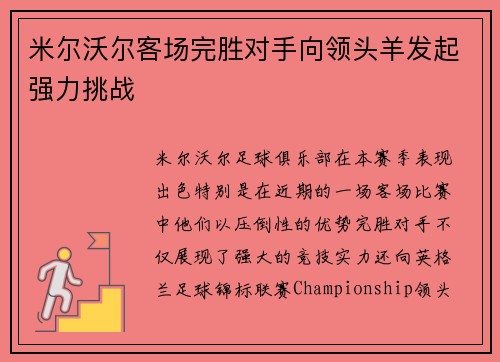 米尔沃尔客场完胜对手向领头羊发起强力挑战