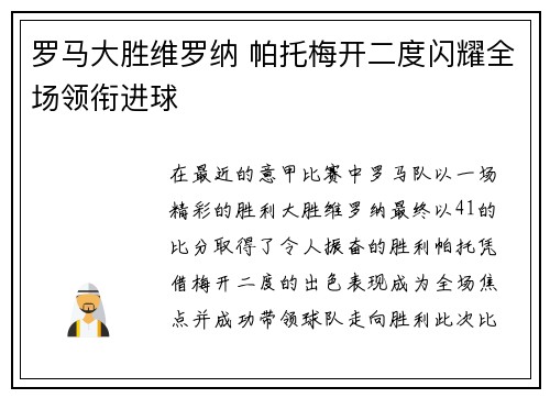 罗马大胜维罗纳 帕托梅开二度闪耀全场领衔进球