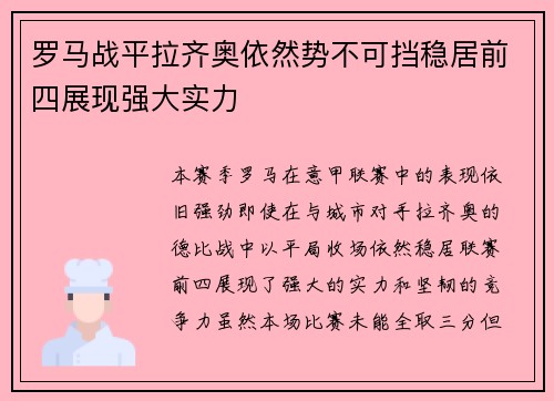 罗马战平拉齐奥依然势不可挡稳居前四展现强大实力