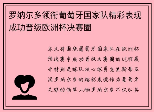 罗纳尔多领衔葡萄牙国家队精彩表现成功晋级欧洲杯决赛圈