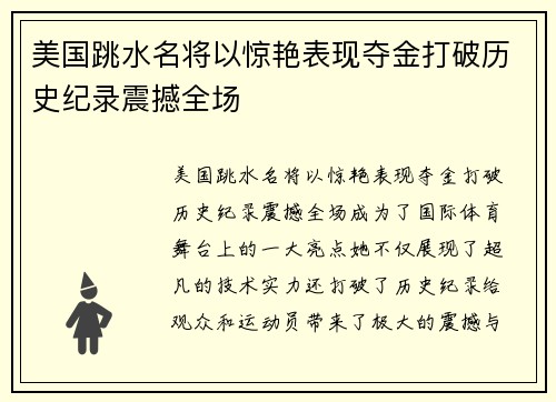 美国跳水名将以惊艳表现夺金打破历史纪录震撼全场