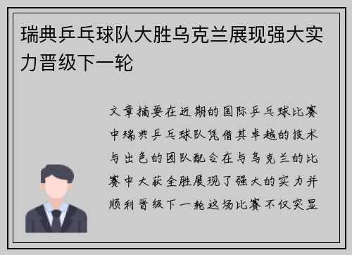 文章摘要:在近期的国际乒乓球比赛中,瑞典乒乓球队凭借其卓越的技术与出色的团队配合,在与乌克兰的比赛中大获全胜,展现了强大的实力,并顺利晋级下一轮。这场比赛不仅突显了瑞典队球员们精湛的个人技巧,更体现了他们在比赛中的高度默契与战术执行力。通过...