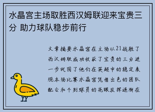 水晶宫主场取胜西汉姆联迎来宝贵三分 助力球队稳步前行