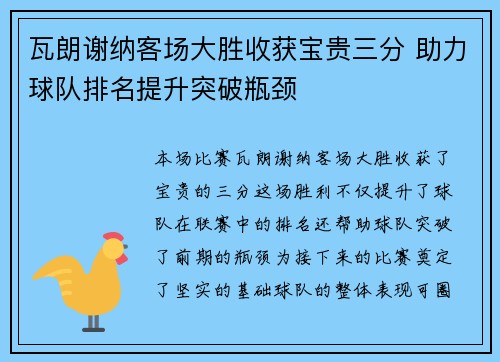 瓦朗谢纳客场大胜收获宝贵三分 助力球队排名提升突破瓶颈