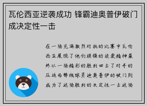 在一场充满激烈对抗的比赛中,瓦伦西亚展现了他们顽强的逆袭精神,最终以一场精彩的胜利回击了对手的压迫,而锋线球员迪奥普伊的破门则成为了这场胜利的决定性一击。这场比赛不仅是一场技术与战术的较量,更是一场精神与信念的对决。瓦伦西亚在上半场曾一度落...