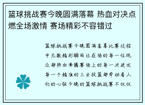 篮球挑战赛今晚圆满落幕 热血对决点燃全场激情 赛场精彩不容错过