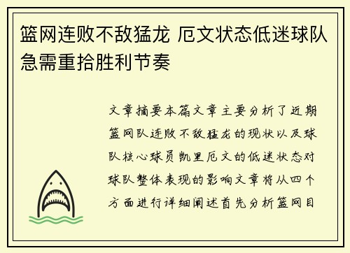 篮网连败不敌猛龙 厄文状态低迷球队急需重拾胜利节奏