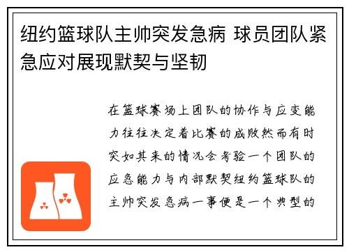 纽约篮球队主帅突发急病 球员团队紧急应对展现默契与坚韧