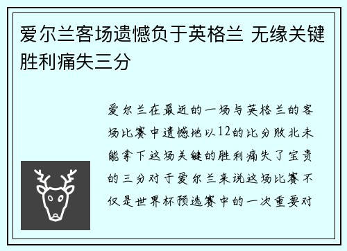 爱尔兰在最近的一场与英格兰的客场比赛中,遗憾地以1-2的比分败北,未能拿下这场关键的胜利,痛失了宝贵的三分。对于爱尔兰来说,这场比赛不仅是世界杯预选赛中的一次重要对决,更是关系到晋级的关键战役。虽然比赛中,爱尔兰一度展现出了强烈的竞争欲望,...