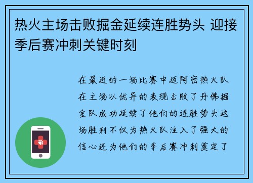 热火主场击败掘金延续连胜势头 迎接季后赛冲刺关键时刻