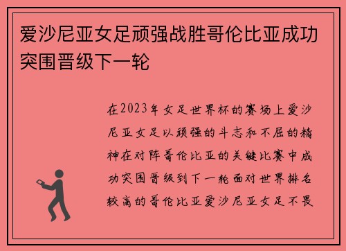 爱沙尼亚女足顽强战胜哥伦比亚成功突围晋级下一轮