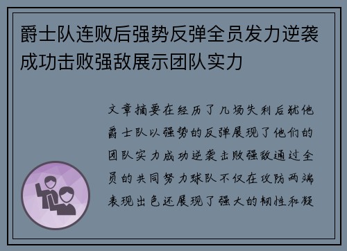 爵士队连败后强势反弹全员发力逆袭成功击败强敌展示团队实力