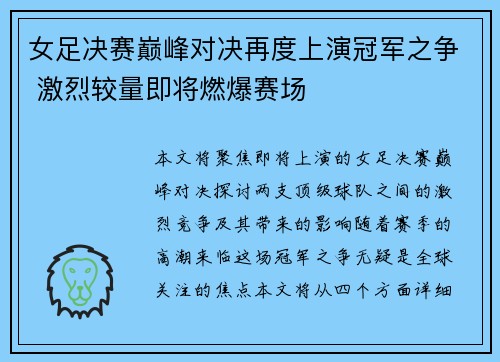女足决赛巅峰对决再度上演冠军之争 激烈较量即将燃爆赛场