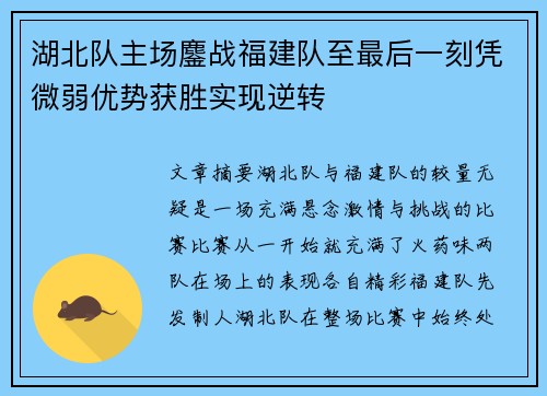湖北队主场鏖战福建队至最后一刻凭微弱优势获胜实现逆转