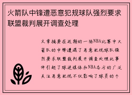 文章摘要:在近期的一场NBA比赛中,火箭队的中锋遭遇了恶意犯规,球队强烈要求联盟裁判展开调查处理。此事件引起了球迷、媒体和NBA各方的广泛关注。恶意犯规不仅影响了球员的个人健康,也对比赛的公平性和联盟的公正性产生了疑问。本文将从四个方面对火...