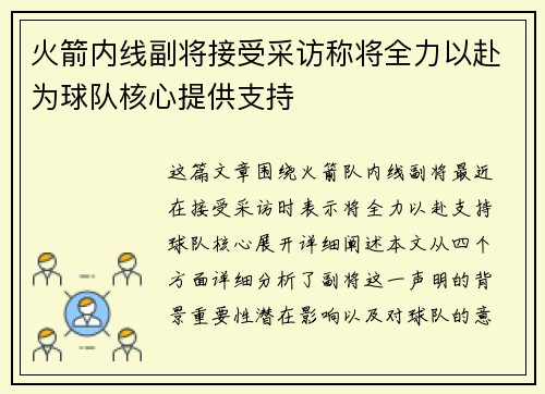 这篇文章围绕火箭队内线副将最近在接受采访时表示将全力以赴支持球队核心展开详细阐述。本文从四个方面详细分析了副将这一声明的背景、重要性、潜在影响以及对球队的意义。首先,文章将回顾火箭队当前的阵容和核心球员,然后分析副将如何通过自己的努力为球队...