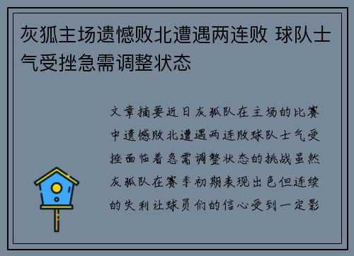 灰狐主场遗憾败北遭遇两连败 球队士气受挫急需调整状态