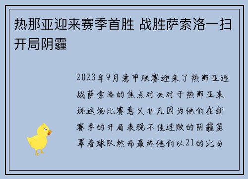 热那亚迎来赛季首胜 战胜萨索洛一扫开局阴霾