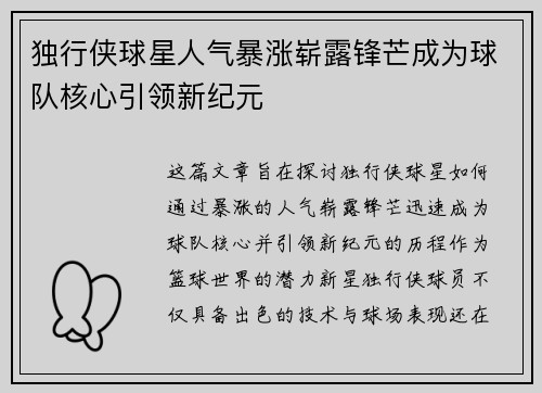独行侠球星人气暴涨崭露锋芒成为球队核心引领新纪元
