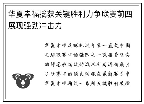 华夏幸福擒获关键胜利力争联赛前四展现强劲冲击力