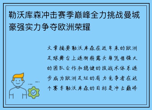 勒沃库森冲击赛季巅峰全力挑战曼城豪强实力争夺欧洲荣耀