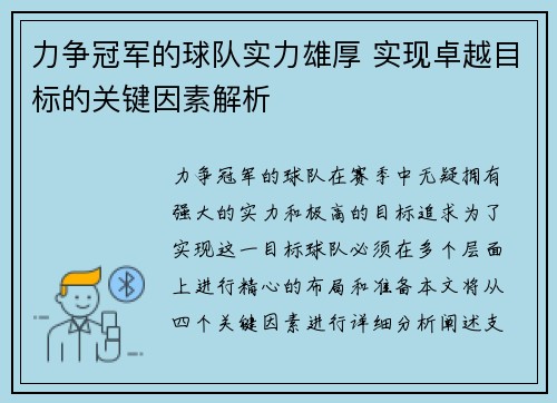 力争冠军的球队实力雄厚 实现卓越目标的关键因素解析