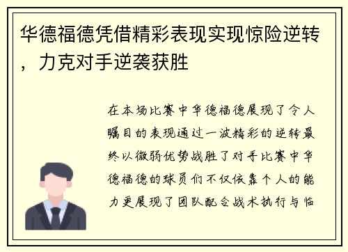 华德福德凭借精彩表现实现惊险逆转,力克对手逆袭获胜
