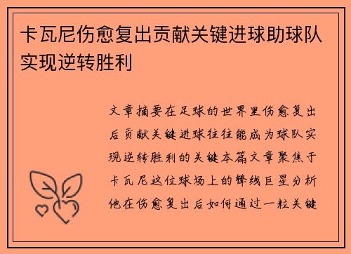 卡瓦尼伤愈复出贡献关键进球助球队实现逆转胜利