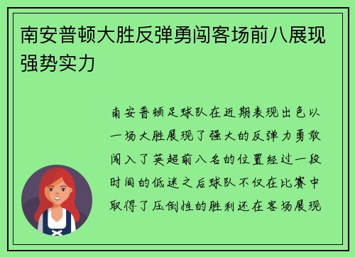南安普顿足球队在近期表现出色,以一场大胜展现了强大的反弹力,勇敢闯入了英超前八名的位置。经过一段时间的低迷之后,球队不仅在比赛中取得了压倒性的胜利,还在客场展现出不容小觑的实力。这场反弹不仅证明了南安普顿的强大韧性,更彰显了他们在比赛中的战...