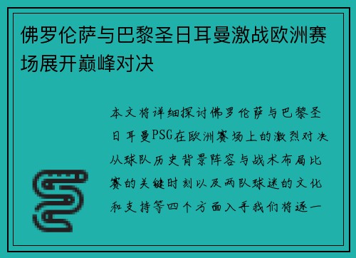 佛罗伦萨与巴黎圣日耳曼激战欧洲赛场展开巅峰对决