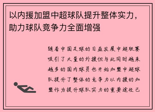 以内援加盟中超球队提升整体实力,助力球队竞争力全面增强