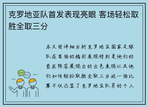 本文将详细分析克罗地亚国家足球队在客场的精彩表现,特别是他们的首发阵容展现出的出色表现,以及他们如何轻松取胜全取三分。这一场比赛不仅凸显了克罗地亚队员的个人实力,更体现了整体配合的默契与高效执行力。通过从四个方面深入分析——克罗地亚队首发阵...