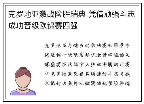 克罗地亚激战险胜瑞典 凭借顽强斗志成功晋级欧锦赛四强
