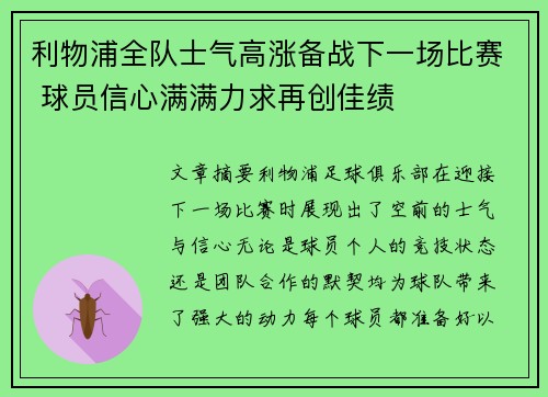 利物浦全队士气高涨备战下一场比赛 球员信心满满力求再创佳绩