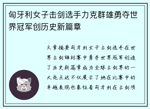 文章摘要:匈牙利女子击剑选手在世界击剑锦标赛中勇夺世界冠军,创造了历史新篇章,成为全球击剑界的一大亮点。这不仅展示了她在比赛中的卓越表现,也象征着匈牙利在击剑项目上的崭新崛起。本文将从选手个人的成长背景、技术特点、比赛过程及对击剑项目的影响...