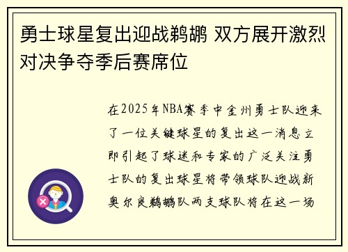 勇士球星复出迎战鹈鹕 双方展开激烈对决争夺季后赛席位