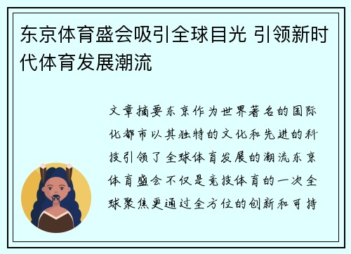 东京体育盛会吸引全球目光 引领新时代体育发展潮流