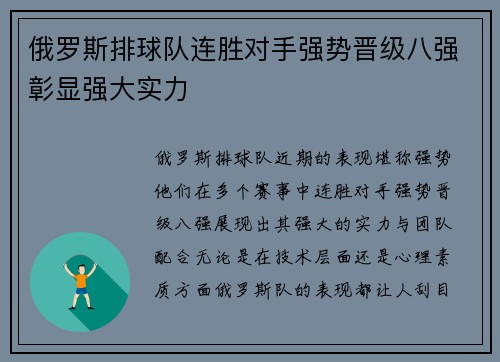 俄罗斯排球队连胜对手强势晋级八强彰显强大实力